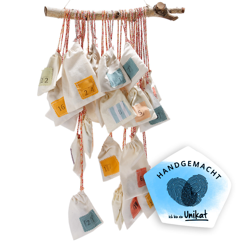 Der Adventskalender ist nachhaltig und langlebig: Du kannst ihn jedes Jahr aufs Neue befüllen. Da sowohl die Aufnäher als auch der mitgelieferte Ast handgearbeitet bzw. naturbelassen sind, sieht jeder Kalender ein wenig anders aus – und wird so zu einem ganz besonderen Unikat.